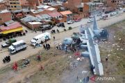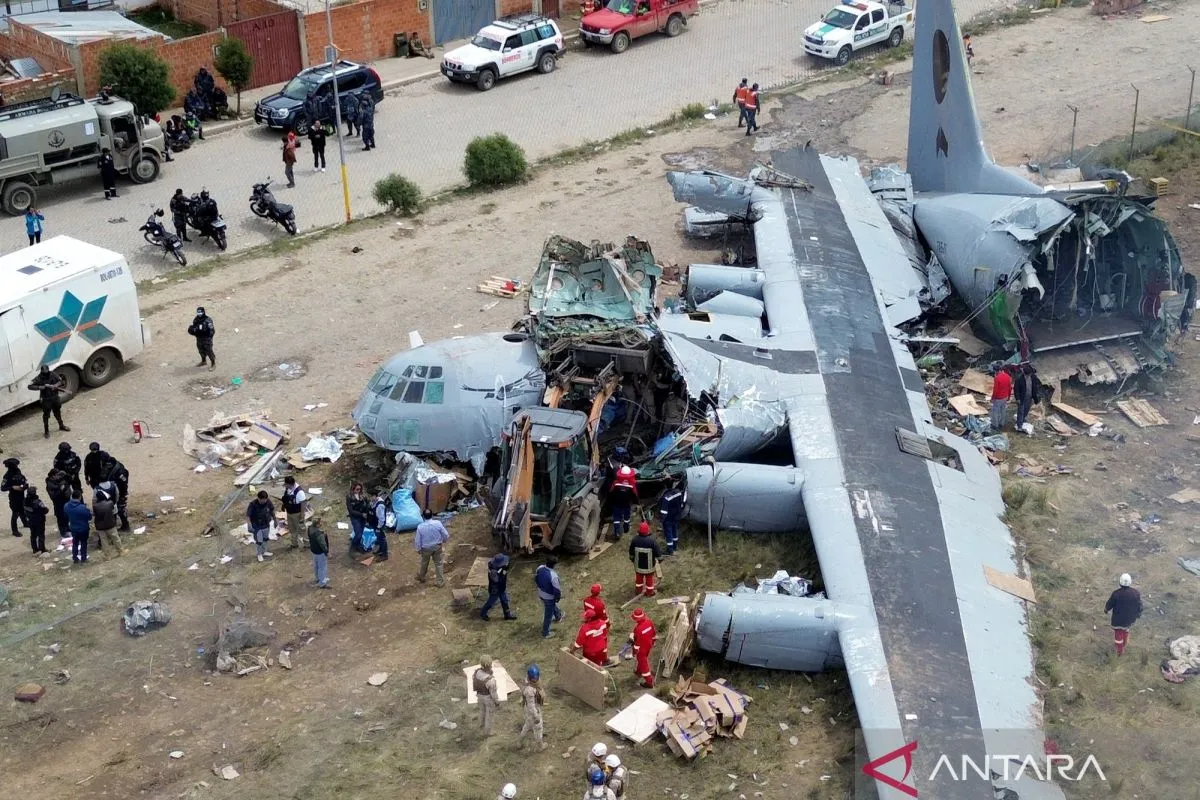 Foto udara kondisi pesawat militer Bolivia yang mengalami kecalakaan di kawasan Bandara Internasional El Alto di El Alto, Bolivia, Sabtu (28/2/2026). Kecelakaan terjadi pada Jumat (27/2) malam ketika pesawat militer Hercules C-130 AU Bolivia keluar dari landasan pacu saat mendarat di Bandara El Alto dan menabrak puluhan kendaraan umum yang mengakibatkan 20 orang korban jiwa dan puluhan lainnya luka-luka. ANTARA FOTO/Xinhua/JavierMamani/nz