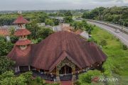 Foto udara suasana Masjid Bambu Saka Buana di Kabupaten Serang, Banten, Minggu (1/3/2026). Masjid yang memiliki luas 260 meter persegi tersebut dibangun dengan menggunakan konstruksi bambu ramah lingkungan dan menawarkan suasana sejuk serta nyaman bagi para jamaah. ANTARA FOTO/Muhammad Bagus Khoirunas//bar