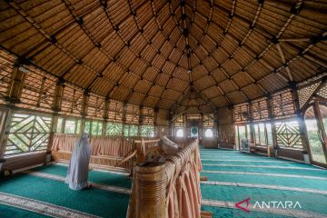 Seorang warga melaksanakan Shalat Ashar di Masjid Bambu Saka Buana, Kabupaten Serang, Banten, Minggu (1/3/2026). Masjid yang memiliki luas 260 meter persegi tersebut dibangun dengan menggunakan konstruksi bambu ramah lingkungan dan menawarkan suasana sejuk serta nyaman bagi para jamaah. ANTARA FOTO/Muhammad Bagus Khoirunas/bar