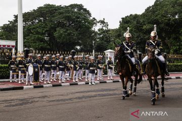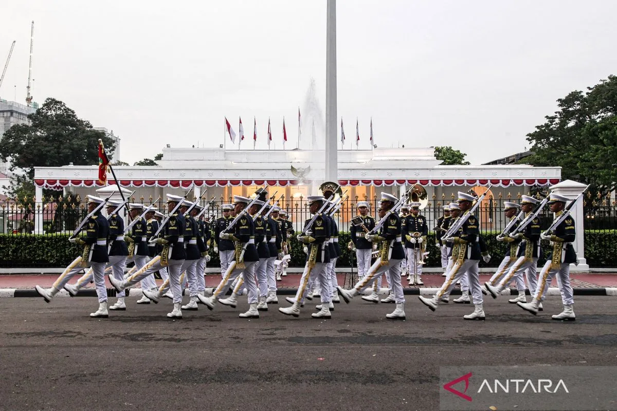 Pasukan Pengaman Presiden (Paspampres) menggelar prosesi serah terima pergantian pasukan jaga Istana di depan Istana Merdeka, Jakarta, Minggu (1/3/2026). Prosesi pergantian pasukan jaga istana merupakan kegiatan rutin yang dilaksanakan setiap hari Minggu tersebut bertujuan untuk lebih mendekatkan Paspampres dengan masyarakat. ANTARA FOTO/Darryl Ramadhan/bar
