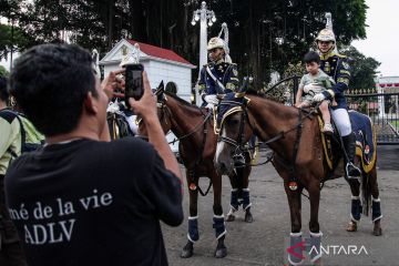 Seorang anak foto bersama Pasukan Pengaman Presiden (Paspampres) usai prosesi serah terima pergantian pasukan jaga Istana di depan Istana Merdeka, Jakarta, Minggu (1/3/2026). Prosesi pergantian pasukan jaga istana merupakan kegiatan rutin yang dilaksanakan setiap hari Minggu tersebut bertujuan untuk lebih mendekatkan Paspampres dengan masyarakat. ANTARA FOTO/Darryl Ramadhan/bar