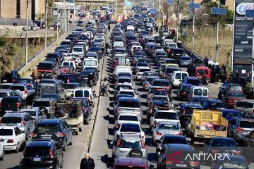 Sejumlah kendaraan terjebak kemacetan saat berusaha mengungsi dari desanya pascaserangan udara di Sidon, Lebanon, Senin (2/3/2026). Sebanyak 31 orang tewas dan 149 luka-luka akibat serangan udara Israel di pinggiran selatan Beirut dan Lebanon selatan. ANTARA FOTO/Xinhua/Ali Hashisho/rwa.