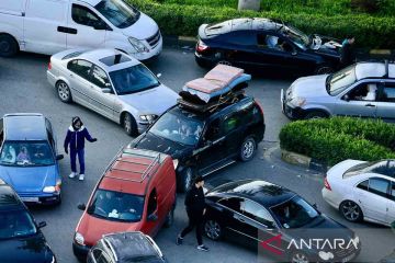 Antrean kendaraan penduduk yang mengungsi dari desanya pascaserangan udara di Sidon, Lebanon, Senin (2/3/2026). Sebanyak 31 orang tewas dan 149 luka-luka akibat serangan udara Israel di pinggiran selatan Beirut dan Lebanon selatan. ANTARA FOTO/Xinhua/Ali Hashisho/rwa.