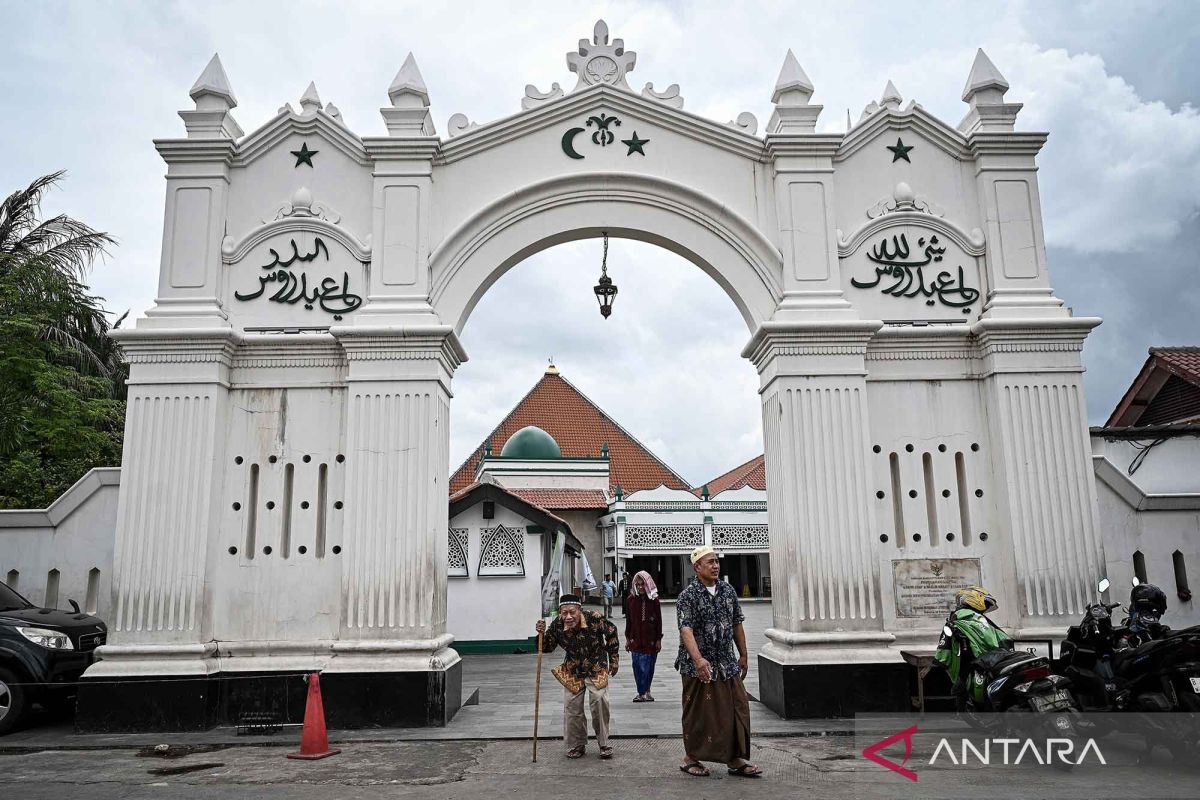 Umat Islam berjalan di area Masjid Luar Batang, Penjaringan, Jakarta, Rabu (4/3/2026). Masjid yang menjadi salah satu cagar budaya ini dibangun oleh ulama Habib Husein bin Abubakar Alaydrus pada tahun 1739 dan kini menjadi destinasi wisata religi yang banyak dikunjungi oleh warga Jakarta maupun dari luar Jakarta. ANTARA FOTO/Fauzan/YU