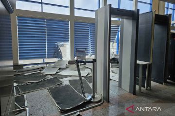 Suasana gedung yang mengalami kerusakan akibat serangan drone di Bandara Internasional Nakhchivan, Azerbaijan, Kamis (5/3/2026). Serangan yang diduga diluncurkan dari Iran pada Kamis (5/3) siang itu, sebuah drone menghantam gedung terminal Bandara Internasional Nakhchivan, melukai dua warga sipil dan menyebabkan kerusakan struktural, sementara drone lain jatuh di dekat sebuah sekolah di desa Shakarabad. ANTARA FOTO/Kantor Berita Negara Azerbaijan Handout via Xinhua/nym.