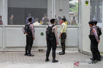 Sejumlah polisi berjaga saat berlangsungnya penggeledahan di PT Simba Jaya Utama di Berbek Industri, Waru, Sidoarjo, Jawa Timur, Kamis (12/3/2026). Direktorat Tindak Pidana Ekonomi Khusus (Dit Tipideksus) Bareskrim Polri melakukan penyidikan terkait dugaan tindak pidana di bidang minerba berupa penambangan emas ilegal serta tindak pidana pencucian uang (TPPU) yang melibatkan perusahaan tersebut. ANTARA FOTO/Umarul Faruq/nz
