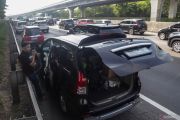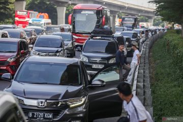 Pemudik beristirahat di bahu jalan di Jalan Tol Jakarta Cikampek, Cikarang, Kabupaten Bekasi, Jawa Barat, Kamis (19/3/2026). Korlantas Polri mengimbau kepada pemudik tidak menggunakan bahu jalan tol untuk beristirahat sebab dapat membahayakan pengguna jalan tol lainnya dan menganggu lalu lintas arus mudik. ANTARA FOTO/Darryl Ramadhan/wsj.