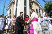 Seorang umat Islam bersalaman dengan romo umat Katolik dalam acara safari Lebaran lintas agama dan kepercayaan di Masjid Nusrat Jahan, Semarang, Jawa Tengah, Sabtu (21/3/2026). Kegiatan yang diikuti oleh tokoh agama hingga masyarakat lintas agama dan kepercayaan tersebut sebagai upaya menumbuhkan dan mempererat silaturahim, kerukunan, serta toleransi sekaligus kedamaian antarumat dalam momentum perayaan Idul Fitri 1447 Hijriah. ANTARA FOTO/Makna Zaezar/nym.