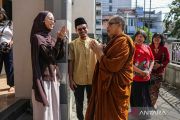 Seorang umat Islam menyambut kedatangan bhante umat Buddha dalam acara safari Lebaran lintas agama dan kepercayaan di Masjid Nusrat Jahan, Semarang, Jawa Tengah, Sabtu (21/3/2026). Kegiatan yang diikuti oleh tokoh agama hingga masyarakat lintas agama dan kepercayaan tersebut sebagai upaya menumbuhkan dan mempererat silaturahim, kerukunan, serta toleransi sekaligus kedamaian antarumat dalam momentum perayaan Idul Fitri 1447 Hijriah. ANTARA FOTO/Makna Zaezar/nym.