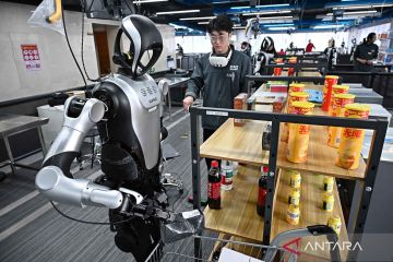 Petugas melakukan pelatihan dan pengumpulan data pada robot humanoid di Pusat Pelatihan Data Robot Humanoid Qingdao di Distrik Laoshan, Qingdao, Provinsi Shandong, China timur, Senin (23/3/2026). Para pengumpul data mengendalikan robot untuk menyelesaikan tugas spesifik seperti penyortiran logistik, pengisian ulang barang supermarket, pekerja dapur, dan perakitan komponen melalui ribuan pengulangan dan percobaan sehingga menghasilkan robot berotak cerdas dan siap memasuki semua lapisan masyarakat untuk melayani rumah tangga. ANTARA FOTO/Xinhua/Li Ziheng/nym.