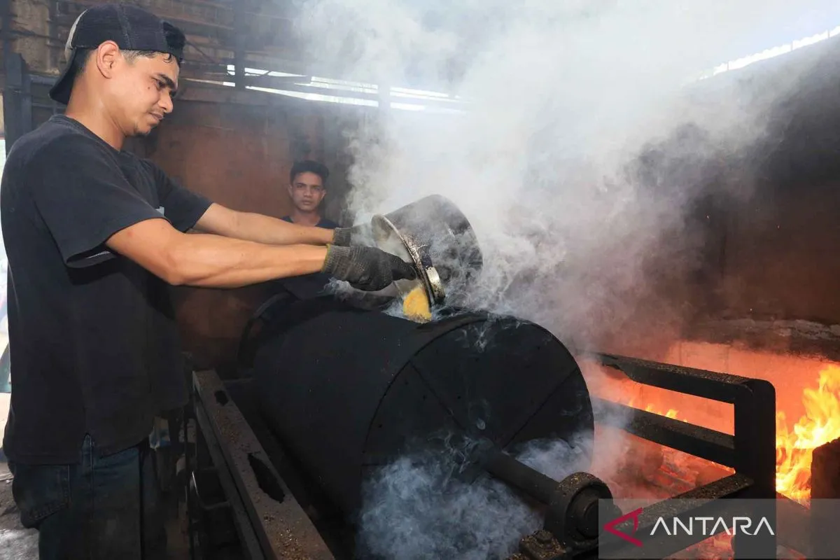 Pekerja menuangkan biji kopi robusta dari tempat pemangangan saat proses pengolahan menjadi bubuk kopi di UKM Taufik Kopi, Banda Aceh, Aceh, Kamis (26/3/2026). Pelaku usaha tersebut mengolah kopi robusta secara tradisional yang dianggap memiliki cita rasa khas yang berbeda dibandingkan pengolahan secara modern, sekaligus memenuhi permintaan pasar lokal hingga ke sejumlah daerah seperti Sumatera Utara, Batam, Jakarta, dan Kalimantan Timur dengan harga jual Rp140 ribu per kilogram. ANTARA FOTO/Akramul Muslim/YU
