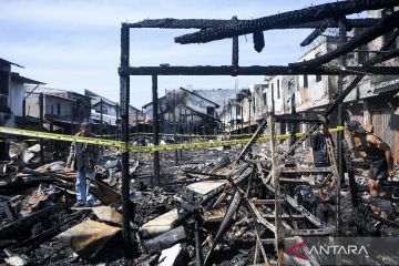 Seorang warga berdiri di atas puing kebakaran di Pasar Segiri, Samarinda, Kalimantan Timur, Kamis (26/3/2026). Kebakaran tersebut mengakibatkan sedikitnya 44 bangunan yang terdiri dari 20 petak kios dan 24 rumah toko ludes terbakar. ANTARA FOTO/M Risyal Hidayat/bar