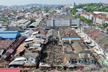 Foto udara lokasi kebakaran di Pasar Segiri, Samarinda, Kalimantan Timur, Kamis (26/3/2026). Kebakaran tersebut mengakibatkan sedikitnya 44 bangunan yang terdiri dari 20 petak kios dan 24 rumah toko ludes terbakar. ANTARA FOTO/M Risyal Hidayat/bar