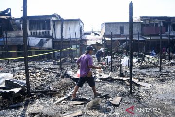 Seorang warga berjalan pada lokasi kebakaran di Pasar Segiri, Samarinda, Kalimantan Timur, Kamis (26/3/2026). Kebakaran tersebut mengakibatkan sedikitnya 44 bangunan yang terdiri dari 20 petak kios dan 24 rumah toko ludes terbakar. ANTARA FOTO/M Risyal Hidayat/bar