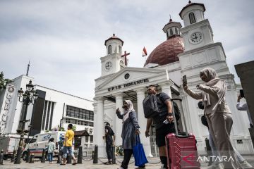 Kunjungan wisata Jateng pada libur Lebaran 2026. Wisatawan berkunjung di kawasan Cagar Budaya Nasional Kota Lama, Semarang, Jawa Tengah, Jumat (27/3/2026). Dinas Kebudayaan, Pariwisata, dan Ekonomi Kreatif (Disbudparekraf) Jawa Tengah mencatat kunjungan wisatawan ke Jawa Tengah selama periode libur panjang Lebaran 2026 (13-25 Maret 2026) mencapai 687.470 orang atau meningkat 5,25 persen dibandingkan periode yang sama pada 2025, dengan Kota Lama Semarang menjadi salah satu destinasi favorit. ANTARA FOTO/Aprillio Akbar/sgd