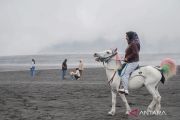 Wisatawan menunggangi kuda saat mengunjungi kawasan Taman Nasional Bromo Tengger Semeru (TNBTS) di Kabupaten Probolinggo, Jawa Timur, Minggu (29/3/2026). Berdasarkan data Balai Besar TNBTS, jumlah kunjungan wisatawan selama periode libur Lebaran pada 21â24 Maret 2026 mencapai 25.588 orang dengan kontribusi terhadap pendapatan negara bukan pajak (PNBP) lebih dari dua miliar rupiah, sementara kawasan Ranu Regulo menyumbang sebesar Rp34,5 juta. ANTARA FOTO/Irfan Sumanjaya/sgd