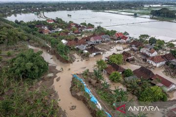 Foto udara kondisi jebolnya tanggul Sungai Tuntang yang menyebabkan banjir bandang di Dukuh Solondoko, Desa Trimulyo, Kecamatan Guntur, Demak, Jawa Tengah, Sabtu (4//4/2026). Menurut data sementara yang dihimpun Pusdatinkom BNPB hingga Sabtu (4/4) pukul 09.00 WIB, jebolnya sejumlah titik tanggul Sungai Tuntang yang tak mampu menampung debit air hujan dari hulu ke hilir pada Jumat (3/4) menyebabkan banjir melanda delapan desa di empat kecamatan Kabupaten Demak, satu orang meninggal, 2.839 jiwa mengungsi ke sejumlah lokasi pengungsian serta lima rumah roboh dan 13 lainnya rusak sedang hingga berat. ANTARA FOTO/Aji Styawan/tom.