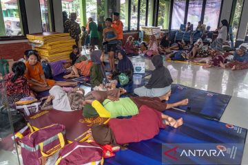 Sejumlah warga yang terdampak banjir bandang karena jebolnya tanggul Sungai Tuntang mengungsi di Aula Kecamatan Guntur, Demak, Jawa Tengah, Sabtu (4//4/2026). Menurut data sementara yang dihimpun Pusdatinkom BNPB hingga Sabtu (4/4) pukul 09.00 WIB, jebolnya sejumlah titik tanggul Sungai Tuntang yang tak mampu menampung debit air hujan dari hulu ke hilir pada Jumat (3/4) menyebabkan banjir melanda delapan desa di empat kecamatan Kabupaten Demak, satu orang meninggal, 2.839 jiwa mengungsi ke sejumlah lokasi pengungsian serta lima rumah roboh dan 13 lainnya rusak sedang hingga berat. ANTARA FOTO/Aji Styawan/tom.