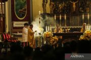 Umat Katolik membawa lilin pada Misa Sabtu Suci di Gereja Katedral, Jakarta, Sabtu (4/4/2026). Misa Sabtu Suci diikuti sekitar 3.500 umat Katolik itu menjadi penghayatan kebangkitan Yesus. ANTARA FOTO/Fakhri Hermansyah/wsj.