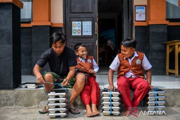 Pekerja bersama siswa membawa Makanan Bergizi Gratis (MBG) untuk dibagikan di SDN Haurpancuh, Bandung, Jawa Barat, Selasa (31/3/2026). Data dari Badan Gizi Nasional (BGN) mencatat, hingga awal Maret 2026 program MBG telah menjangkau sekitar 61,2 juta penerima manfaat dan ditargetkan akan mencapai 82,9 juta penerima pada akhir 2026. ANTARA FOTO/Raisan Al Farisi/wsj.