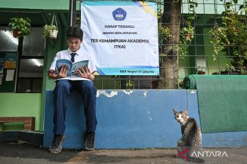 Siswa belajar sebelum mengikuti ujian Tes Kemampuan Akademik (TKA) Asesmen Nasional Berbasis Komputer di SMP Negeri 61 Jakarta, Jakarta, Selasa (7/4/2026). Kementerian Pendidikan Dasar dan Menengah (Kemendikdasmen) menyelenggarakan TKA Nasional pada jenjang SD/MI, SMP/MTs, dan SMA/MA/SMK guna memetakan mutu pendidikan, validator Seleksi Nasional Berdasarkan Prestasi (SNBP) serta seleksi masuk ke jenjang pendidikan selanjutnya. ANTARA FOTO/Sulthony Hasanuddin/agr