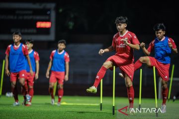 Pesepak bola Timnas Indonesia U-17 Made Arbi Ananta (kedua kanan) melakukan sesi latihan di Stadion Gelora 10 November, Surabaya, Jawa Timur, Kamis (9/4/2026). Latihan tersebut sebagai persiapan Piala AFF U-17 di Sidoarjo dan Gresik yang berlangsung pada 11-24 April 2026. ANTARA FOTO/Rizal Hanafi/tom.