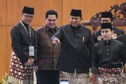 Presiden yang juga Ketua Umum Pengurus Besar Ikatan Pencak Silat Indonesia (PB IPSI) Prabowo Subianto (ketiga kiri) berbincang dengan Menpora Erick Thohir (kedua kiri) dan Menlu yang juga Waketum PB IPSI Sugiono (kiri) saat menghadiri pembukaan Musyawarah Nasional (Munas) XVI PB IPSI di JCC Senayan, Jakarta, Sabtu (11/4/2026). Pada Munas tersebut Prabowo Subianto mengatakan tidak akan melanjutkan jabatannya sebagai Ketua Umum PB IPSI. ANTARA FOTO/Hafidz Mubarak A/sgd