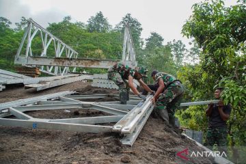 Sejumlah personel TNI memasang rangka jembatan bailey di Kabupaten Probolinggo, Jawa Timur, Senin (13/4/2026). Personel Batalyon Zeni Tempur (Yonzipur) V/Arathi Bhaya Wighina (ABW) Malang mulai memasang jembatan bailey sebagai akses sementara pasca terputusnya jalan menuju wisata Air Terjun Madakaripura sepanjang sekitar 20 meter akibat longsor, dengan target pengerjaan selama 14 hari. ANTARA FOTO/Irfan Sumanjaya/nym.