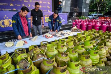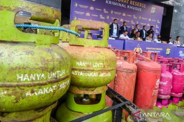 Polisi merapikan barang bukti saat konferensi pers kasus penyalahgunaan gas elpiji bersubsidi di Polda Metro Jaya, Jakarta, Kamis (16/4/2026). Direktorat Reserse Kriminal Khusus Polda Metro Jaya mengamankan 10 orang tersangka beserta barang bukti berupa 1.259 tabung gas elpiji dalam kasus tindak pidana penyalahgunaan gas elpiji bersubsidi dengan cara memindahkannya ke tabung kosong gas nonsubsidi untuk meraup keuntungan. ANTARA FOTO/Rivan Awal Lingga/sgd