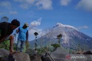 Asap vulkanik keluar dari kawah Gunung Semeru terlihat dari Desa Supiturang, Lumajang, Jawa Timur, Senin (20/4/2026). Berdasarkan laporan Pusat Vulkanologi dan Mitigasi Bencana Geologi (PVMBG) periode pengamatan Minggu (19 April 2026) 00:00-24:00, Semeru tercatat mengalami 49 kali gempa letusan, satu kali gempa awan panas guguran, dan 18 kali gempa hembusan, sehingga warga diimbau tidak beraktivitas di sektor tenggara sepanjang Besuk Kobokan hingga jarak 13 kilometer dari kawah. ANTARA FOTO/Irfan Sumanjaya/YU