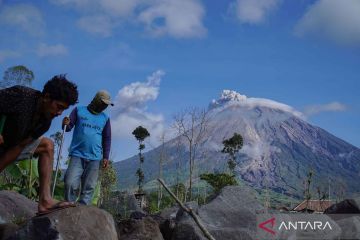 Dua warga beraktivitas dengan latar belakang Gunung Semeru mengeluarkan asap vulkanik, di Desa Supiturang, Lumajang, Jawa Timur, Senin (20/4/2026). Berdasarkan laporan Pusat Vulkanologi dan Mitigasi Bencana Geologi (PVMBG) periode pengamatan Minggu (19 April 2026) 00:00-24:00, Semeru tercatat mengalami 49 kali gempa letusan, satu kali gempa awan panas guguran, dan 18 kali gempa hembusan, sehingga warga diimbau tidak beraktivitas di sektor tenggara sepanjang Besuk Kobokan hingga jarak 13 kilometer dari kawah. ANTARA FOTO/Irfan Sumanjaya/kyeANTARA FOTO/Irfan Sumanjaya (ANTARA FOTO/Irfan Sumanjaya)