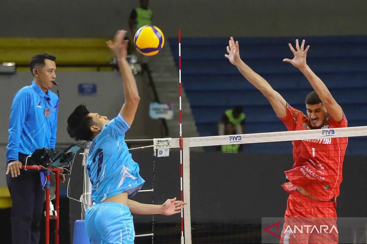 Pevoli Surabaya Samator Lyvan Taboada Diaz (kanan) memblok bola pukulan pevoli Jakarta Garuda Jaya M. Haikal Hidayatullah (kiri) pada laga Grand Final Proliga 2026 di GOR Amongrogo, Yogyakarta, Selasa (21/4/2026). Surabaya Samator menang atas Jakarta Garuda Jaya dengan Skor 3-0 (25-17, 25-20, dan 25-20). ANTARA FOTO/Andreas Fitri Atmoko/nym.