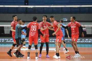 Pevoli Surabaya Samator melakukan selebrasi setelah mencetak skor saat melawan tim voli Jakarta Garuda Jaya pada laga Grand Final Proliga 2026 di GOR Amongrogo, Yogyakarta, Selasa (21/4/2026). Surabaya Samator menang atas Jakarta Garuda Jaya dengan Skor 3-0 (25-17, 25-20, dan 25-20). ANTARA FOTO/Andreas Fitri Atmoko/nym.