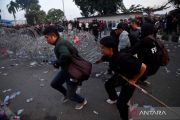 Personel Polri berusaha membubarkan pengunjuk rasa di depan kantor Gubernur Kalimantan Timur, Samarinda, Kalimantan Timur, Selasa (21/4/2026). Aksi unjuk rasa yang menuntut audit terhadap seluruh kegiatan Pemprov Kalimantan Timur serta menghentikan praktik politik dinasti hingga praktik korupsi, kolusi dan nepotisme (KKN) di daerah tersebut berakhir ricuh. ANTARA FOTO/Angga Palguna/nym.