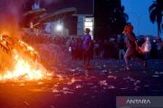 Pengunjuk rasa melemparkan karung ke arah polisi saat unjuk rasa di depan kantor Gubernur Kalimantan Timur, Samarinda, Kalimantan Timur, Selasa (21/4/2026). Aksi unjuk rasa yang menuntut audit terhadap seluruh kegiatan Pemprov Kalimantan Timur serta menghentikan praktik politik dinasti hingga praktik korupsi, kolusi dan nepotisme (KKN) di daerah tersebut berakhir ricuh. ANTARA FOTO/Angga Palguna/nym.
