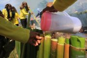 Peserta menuangkan santan ke dalam bambu saat proses memasak lemang (theut leumang) di bantaran sungai Desa Lhueng Asan, Aceh Barat Daya (Abdya), Aceh, Sabtu (25/4/2026). Kegiatan dengan memasak 15.000 batang lemang secara bersama-sama itu memecahkan rekor Museum Rekor Dunia Indonesia (MURI) dalam menyambut HUT ke-24 kabupaten setempat. ANTARA FOTO/Syifa Yulinnas/foc.
