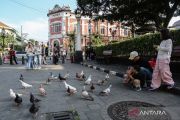 Sejumlah wisatawan domestik memberi makan burung merpati di kawasan wisata Cagar Budaya Nasional Kota Lama, Semarang, Jawa Tengah, Minggu (26/4/2026). Dinas Kebudayaan, Pariwisata, dan Ekonomi Kreatif Jawa Tengah mencatat kinerja sektor pariwisata provinsi tersebut pada Kuartal-I 2026 tumbuh positif dengan total kunjungan mencapai 17,21 juta orang baik wisatawan nusantara dan mancanegara atau meningkat sebesar 18,72 persen dibandingkan periode yang sama tahun lalu yakni sebanyak 13,98 juta orang. ANTARA FOTO/Makna Zaezar/wsj.
