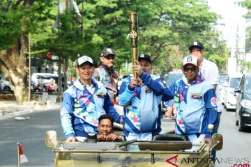 Gubernur Sulsel Nurdin Abdullah (kanan) bersama Ketua Panitia Pelaksana Asian Para Games (Inapgoc) Raja Sapta Oktohari (kiri) dan atlet lempar lembing Bahar Rahman (tengah) membawa obor saat Pawai Obor Asian Para Games di Makassar, Sulawesi Selatan, Rabu (12/9/2018). Asian Para Games 2018 akan berlangsung 6-13 Oktober 2018 di Jakarta dan Palembang. ANTARA FOTO/Yusran Uccang/pras.
