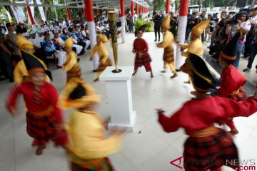 Sejumlah penari 'ganrang bulo" mengelilingi Obor Asian Para Games 2018 saat akan di arak di Makassar, Sulawesi Selatan, Rabu (12/9/2018). Asian Para Games 2018 akan berlangsung 6-13 Oktober 2018 di Jakarta dan Palembang. ANTARA FOTO/Yusran Uccang/pras.