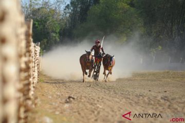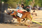 Joki memacu sapi kerapan di lapangan Desa Murtajih, Pamekasan, Jawa Timur, Senin (24/9/2018). Seleksi kerapan sapi memperebutkan Piala Presiden 2018 tingkat kabupaten akan digelar Minggu (7/10) dan Grand Final berlangsung 21 Oktober mendatang yang akan diikuti 24 pasang sapi se-Madura. ANTARA FOTO/Saiful Bahri/wsj.