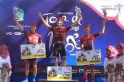 Pebalap sepeda Marcus Culey (tengah) bersama Zenovich Mathew (kiri) dan Dyball Benjamin (kanan) dari ST George Continental Cycling Team, menerima hadiah setelah menjuarai International Tour de Banyuwangi Ijen (ITDBI) di Banyuwangi, Jawa Timur, Rabu (26/9/2018). Pada etape pertama ITDBI tiga pebalap Australia dari ST George Continental Cycling Team menjadi yang tercepat, sementara Best Indonesian Riders diraih Selamat Juangga dari KFC Cycling Team. ANTARA FOTO/Budi Candra Setya/wsj.