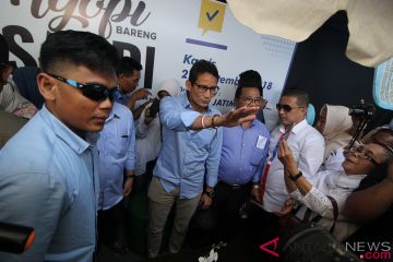 Calon wakil presiden nomor urut 02 Sandiaga Salahuddin Uno (tengah) menyapa warga saat acara Ngopi Bareng Sandi di Surabaya, Jawa Timur, Kamis (27/9/2018). Pada kesempatan itu Sandiaga Uno berjanji akan melakukan perbaikan ekonomi dan menyerap aspirasi dari generasi milenial. ANTARA FOTO/Moch Asim/pras.