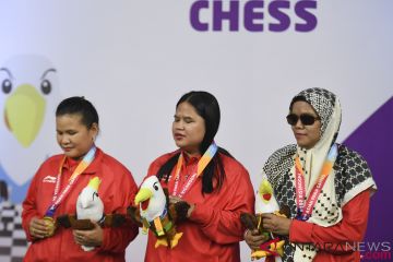 Pecatur putri Indonesia Wilma Margaretha Sinaga (kiri), Karhati Tati (tengah) dan Debi Ariesta (kanan) berpose seusai menerima medali emas kategori catur standar B1 beregu putri Asian Para Games 2018 di Cempaka Putih Sports Hall, Jakarta, Rabu (10/10). ANTARA FOTO/Dhemas Reviyanto/ama