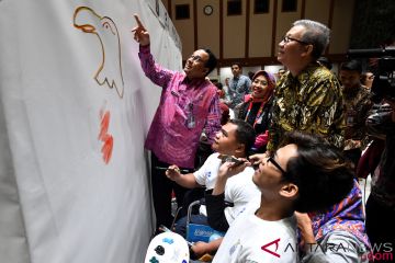Gubernur DKI Jakarta Anies Baswedan (kiri) menyapa penyandang disabilitas saat meresmikan kegiatan melukis mural di kanvas di Balai Agung, Jakarta, Kamis (11/10/2018). Kegiatan melukis di kanvas sepanjang 20 meter ini untuk memberikan kesempatan para penyandang disabilitas menunjukkan karya terbaiknya. ANTARA FOTO/Rivan Awal Lingga/kye