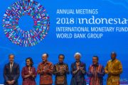 Presiden Joko Widodo (tengah) didampingi Menteri Keuangan Sri Mulyani Indrawati (kedua kiri) dan Gubernur Bank Indonesia Perry Warjiyo (kedua kanan) berfoto bersama Direktur Pelaksana IMF Christine Lagarde (ketiga kanan), Presiden Grup Bank Dunia Jim Yong Kim (ketiga kiri), Gubernur Bank Sentral Inggris Mark Carney yang juga Ketua Dewan Stabilitas Keuangan IMF (kiri) dan Gubernur Bank Sentral Afrika Selatan Lesetja Kganyago yang juga Ketua Komite Moneter dan Keuangan Internasional IMF (kanan) saat menghadiri acara The Bali Fintech Agenda dalam rangkaian Pertemuan Tahunan IMF - WBG 2018 di Mangapura Hall, BICC, Nusa Dua, Bali, Kamis (11/10/2018). The Bali Fintech Agenda akan membahas berbagai peluang dan tantangan yang bisa diperoleh dari teknologi yang berpotensi mengubah lansekap ekonomi dan keuangan. ANTARA FOTO/ICom/AM IMF - WBG/Afriadi Hikmal/kye
