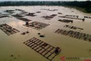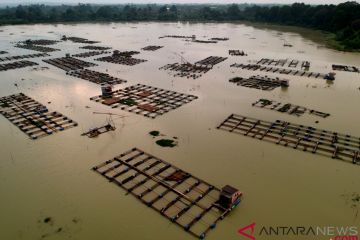 Keramba apung milik warga menghiasi kawasan Danau Teluk Kenali, Telanaipura, Jambi, Senin (15/10/2018). Data Dinas Kelautan dan Perikanan Provinsi Jambi menyebutkan, sebanyak tujuh spesies ikan air tawar daerah itu berstatus kritis, di antaranya belida (Notopterus chitala), baung (Macrones nemurus), dan serandang (Channa pleurophthalma) akibat maraknya penambangan emas ilegal di hulu Sungai Batanghari. ANTARA FOTO/Wahdi Septiawan/foc.