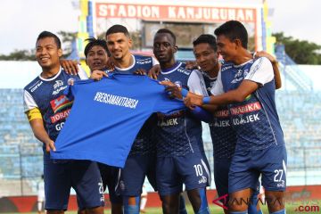 Pesepakbola Arema FC, Makan Konate (ketiga kanan) melakukan selebrasi bersama rekan-rekannya usai mencetak gol ke gawang PSMS Medan dalam pertandingan Liga I GOJEK di Stadion Kanjuruhan Malang, Minggu (28/10/2018). Arema FC mengalahkan PSMS Medan dengan skor 5-0. ANTARA FOTO/Ari Bowo Sucipto/ama.