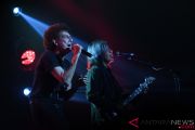 Vokalis grup band God Bless Ahmad Albar (kiri) dan gitaris Ian Antono beraksi pada konser bertajuk "45th God Bless Anniversary eConcert" di Telkom Landmark Tower, Jakarta, Sabtu (3/11/2018). Konser ini digelar untuk merayakan 45 Tahun kiprah God Bless dalam blantika musik Tanah Air. ANTARA FOTO/Wahyu Putro A/kye.