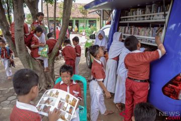 Sejumlah pelajar membaca buku perpustakaan di Kabupaten Batang, Jawa Tengah, Kamis (8/11/2018). Dinas Perpustakaan dan Kearsipan Kabupaten Batang mengkampanyekan budaya membaca dengan jemput bola menggunakan perpustakaan mobil keliling di setiap sekolah setiap hari agar minat baca anak sejak usia dini dapat terjaga. ANTARA FOTO/Harviyan Perdana Putra/ama.