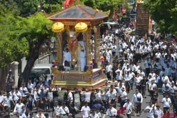 Ribuan warga mengarak peti jenazah berbentuk sapi dalam iring-iringan prosesi kremasi jenazah tokoh Puri (kerajaan) Denpasar Ida Anak Agung Ayu Oka Pemecutan di Denpasar, Bali, Rabu (14/11/2018). Upacara kremasi itu merupakan ritual Ngaben terbesar yang diperuntukan bagi jenazah Ida Anak Agung Ayu Oka Pemecutan yaitu istri dari Ida Tjokorda Raja Denpasar IX. ANTARA FOTO/Nyoman Budhiana/kye.